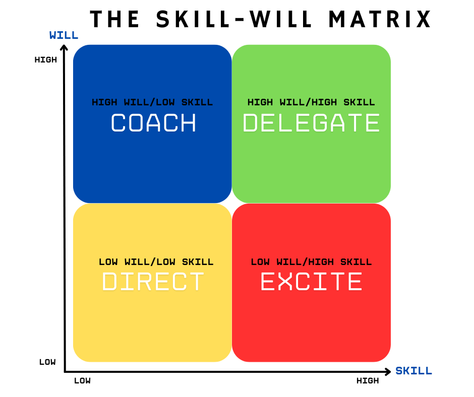 A useful way to determine which leadership style to use is based on Max Landberg’s “Skill-Will Matrix”. Leaders can use this matrix to plot where their team members fall on the matrix, then use the most appropriate style for each combination of person and situation. Will refers to motivation or enthusiasm for the task, challenge or overall demeanour and drive at work. Skill refers to competence or ability to carry out the task or challenge. It can include experience level.